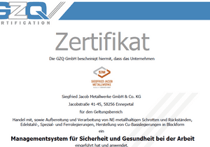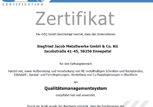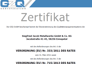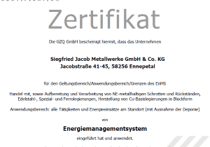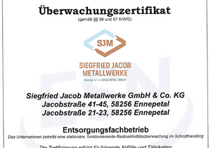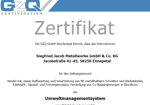 As a recycling company, we are certified according to the German Ordinance on Specialized Waste Management Companies (Entsorgungsfachbetriebsverordnung EfbV). In addition, we have further certifications according to DIN EN ISO 9001 for the quality management system(QMS), DIN EN ISO 14001 for the environmental management system(UMS), DIN EN ISO 45001 for the occupational health and safety management system(AMS) and DIN EN ISO 50001 for the energy management system(EnMS). In addition, we are also certified according to EU Regulation 333/2011 (iron and steel scrap) and 715/2013 (copper scrap) (end of waste).